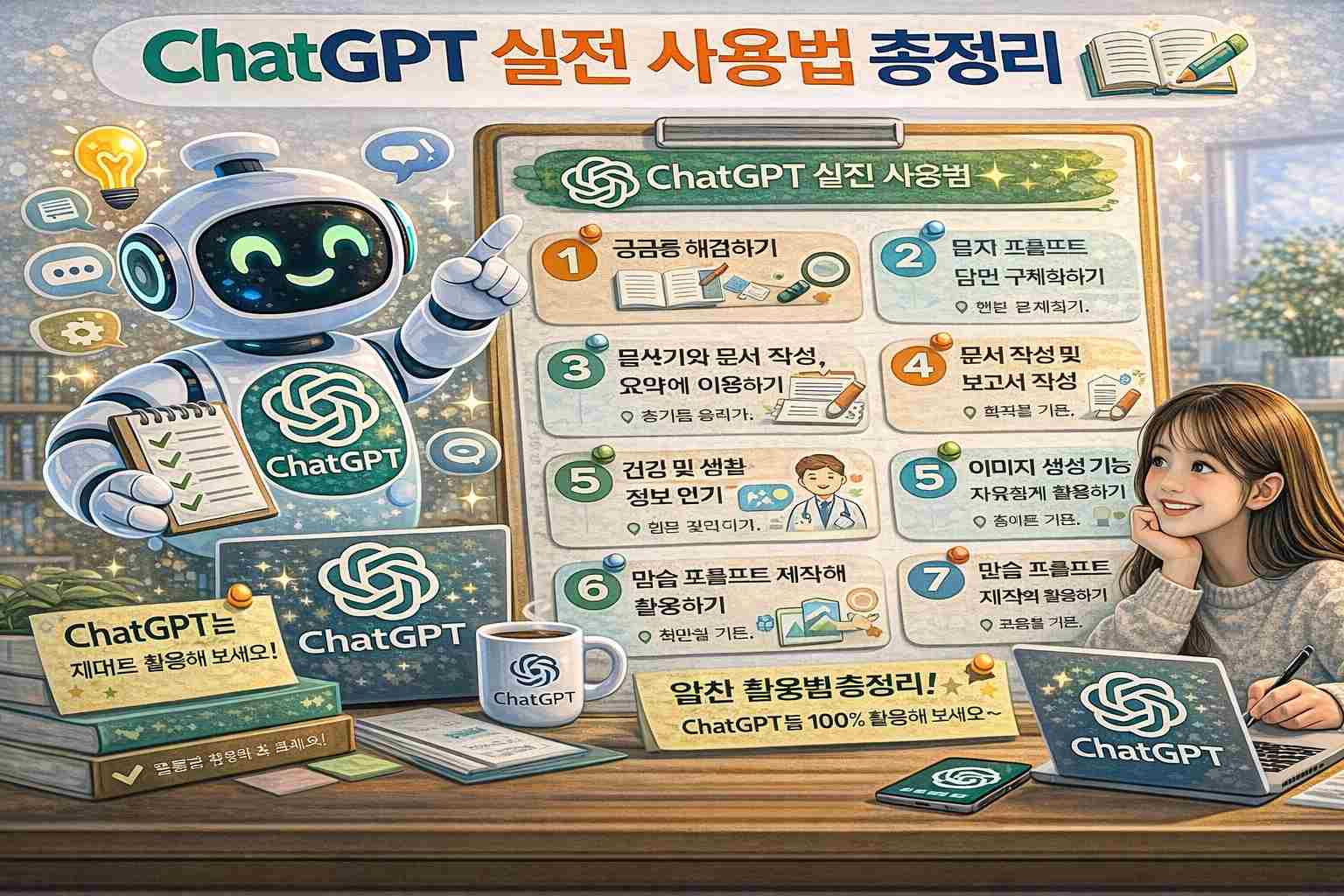 ChatGPT는 단순한 인공지능 대화 서비스가 아니라 다양한 작업을 도와주는 강력한 생산성 도구입니다. 명확한 질문을 하고 단계적으로 활용하면 더 정확한 결과를 얻을 수 있으며 글쓰기, 아이디어 생성, 학습 지원, 업무 효율 향상 등 다양한 분야에서 활용할 수 있습니다. 특히 ChatGPT를 잘 활용하면 시간을 절약하고 더 효율적으로 작업을 진행할 수 있습니다. 앞으로 인공지능 기술이 더욱 발전하면서 ChatGPT와 같은 AI 도구는 우리의 일상과 업무에서 필수적인 도구로 자리 잡을 것입니다.